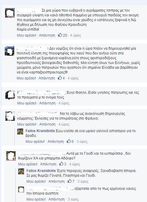 Ποικίλες οι απόψεις που διατυπώθηκαν στα σχόλια κάτω από την ανάρτηση. Οι περισσότεροι διαδικτυακοί φίλοι του Φαήλου Κρανιδιώτη επιδοκίμασαν τη στάση και τις απόψεις του και άλλοι είδαν ή διατύπωσαν την ανάγκη δημιουργίας πατριωτικού κόμματος. Βέβαια δεν έλειψαν από τα σχόλια και οι ακραίες φωνές. Μάλιστα σε κάποιες περιπτώσεις μπήκε και ο ίδιος σε συζήτηση με όσους σχολίασαν στον «τοίχο» του.