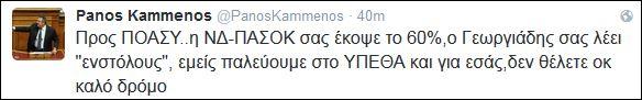 Από την πλευρά του ο κ. Πάνος Καμμένος εξαπέλυσε αιχμές κατά των συνδικαλιστικών οργάνων των Σωμάτων Ασφαλείας, σχολιάζοντας στο Twitter, πρώτα, ότι διαμαρτύρονται σε λάθος υπουργείο και ύστερα: «Προς ΠΟΑΣΥ. H ΝΔ-ΠΑΣΟΚ σας έκοψε το 60%, ο Γεωργιάδης σας λέει "ενστόλους", εμείς παλεύουμε στο ΥΠΕΘΑ και για εσάς, δεν θέλετε οκ καλό δρόμο».