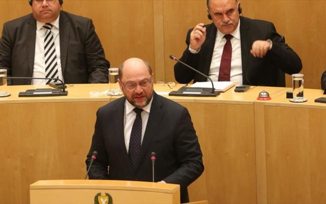 «Η επανένωση της Κύπρου έχει καταστεί ρεαλιστική πιθανότητα και πρέπει να αδράξουμε αυτή την ιστορική ευκαιρία», δήλωσε ο πρόεδρος του Ευρωπαϊκού Κοινοβουλίου Μάρτιν Σουλτς σε ομιλία του στην κυπριακή βουλή.