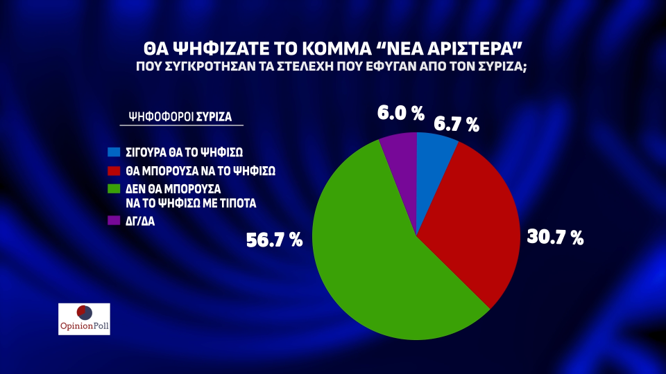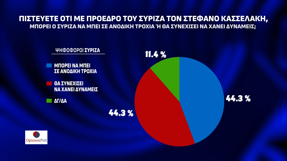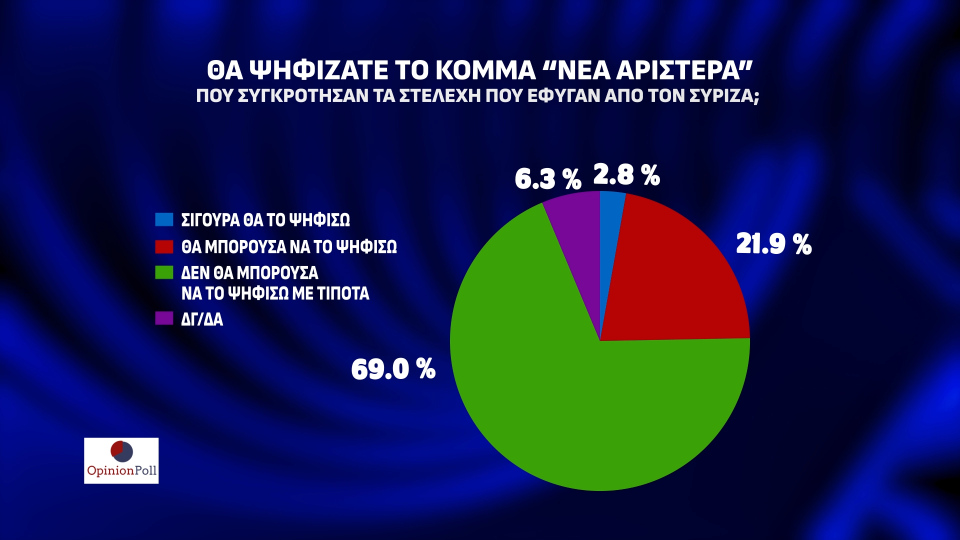Σταθερή πρωτιά και με μεγάλο προβάδισμα διατηρεί η ΝΔ στην πρόθεση ψήφου. Συγκεκριμένα η ΝΔ συγκεντρώνει 34%, το ΠΑΣΟΚ έρχεται δεύτερο με 13,6% (διαφορά 20,4 μονάδων), ενώ ο ΣΥΡΙΖΑ είναι στην τρίτη θέση με 11,8%. Ακολουθούν ΚΚΕ με 8,1%, Ελληνική Λύση με 5,9% και Νίκη οριακά εντός Βουλής με 3,1%. Εκτός του ορίου του 3% μένουν οι Σπαρτιάτες με 2,4%, Νέα Αριστερά και Πλεύση με 2,3% και ΜέΡΑ25 με 2,1%.