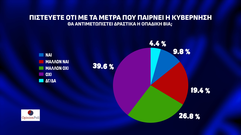 Για τα μέτρα που παίρνει η κυβέρνηση για να αντιμετωπιστεί την οπαδική βία, το 66,4% πιστεύει ότι δεν μπορεί ή μάλλον δεν μπορεί να αντιμετωπίσει το πρόβλημα, έναντι μόλις 29,2% που έχει θετική γνώμη.