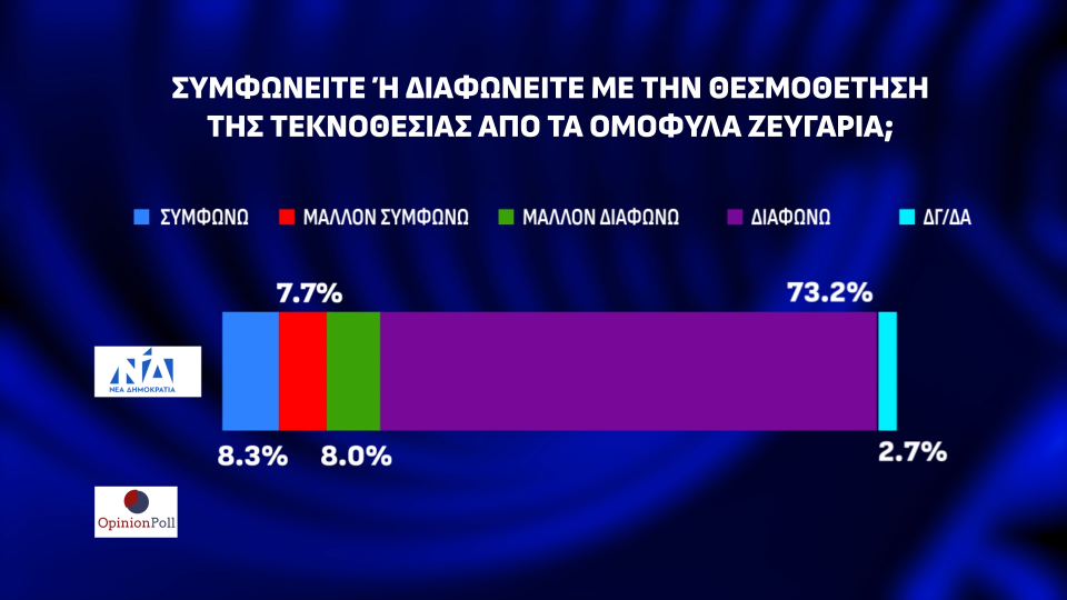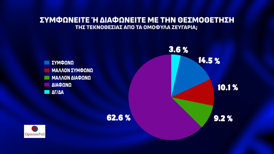 Αναφορικά με την θεσμοθέτηση του γάμου των ομόφυλων ζευγαριών το 42,7% τάσσεται υπέρ και το 53,3% τάσσεται κατά. Το 24,5% τάσσεται υπέρ της τεκνοθεσίας από τα ομόφυλα ζευγάρια, με το 71,8% να έχει αντίθετη άποψη