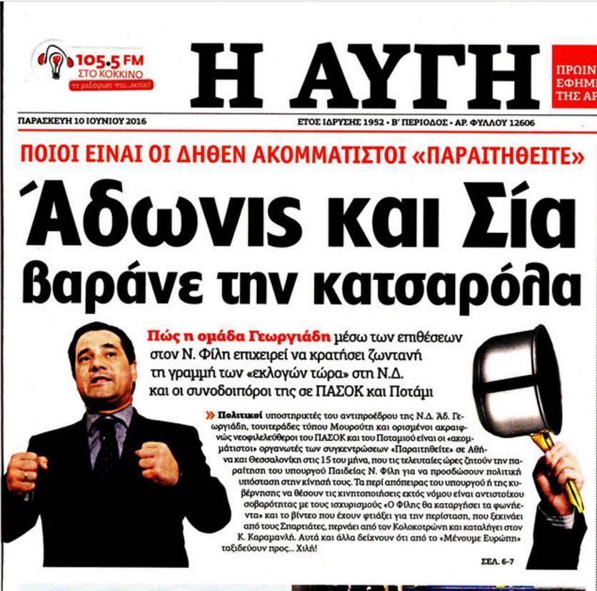Με πρωτοσέλιδο τίτλο «Άδωνις και Σία βαράνε την κατσαρόλα» και "καπέλο" «Ποιοι είναι οι δήθεν ακομμάτιστοι "Παραιτηθείτε"», η αφημερίδα "ΑΥΓΗ" στηρίζει τον υπουργό Παιδείας Νίκο Φίλη για τις δηλώσεις του, που το Μαξίμου χαρακτήρισε "προσωπικές απόψεις".