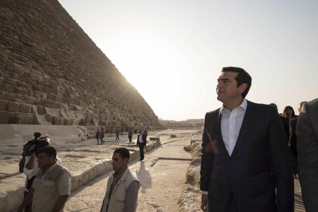 Με την ολοκλήρωση της τριμερούς Συνόδου και κατόπιν πρόσκλησης του Αιγύπτιου υπουργού Τουρισμού, ο Αλέξης Τσίπρας, η Όλγα Γεροβασίλη και η Έλενα Κουντουρά, συνοδευόμενοι από μέλη της ελληνικής πρεσβείας, πραγματοποίησαν σύντομη επίσκεψη στις Πυραμίδες.
