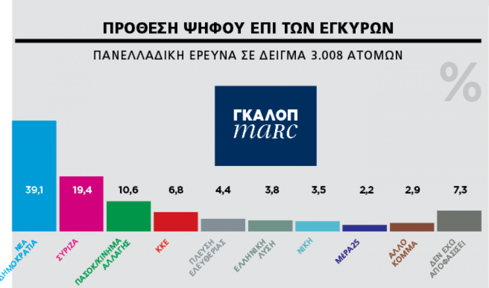 Στην πρόθεση ψήφου επί των εγκύρων, η ΝΔ συγκεντρώνει 39,1%, ο ΣΥΡΙΖΑ 19,4%, το ΠΑΣΟΚ 10,6%, το ΚΚΕ 6,8%, η Πλεύση Ελευθερίας 4,4%, η Ελληνική Λύση 3,8% και η Νίκη 3,5%. Το ΜέΡΑ25 μένει εκτός Βουλής με ποσοστό 2,2%.