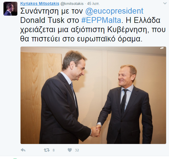 Η Ελλάδα χρειάζεται μια αξιόπιστη κυβέρνηση, που θα πιστεύει στο ευρωπαϊκό όραμα δήλωσε ο πρόεδρος της ΝΔ Κυριάκος Μητσοτάκης κατά τη συνάντησή του με τον πρόεδρο του Ευρωπαϊκού Συμβουλίου, Ντόναλντ Τουσκ, στο περιθώριο του συνεδρίου του ΕΛΚ στην Μάλτα, σύμφωνα με ανάρτηση του πρόεδρου της ΝΔ στο twitter.