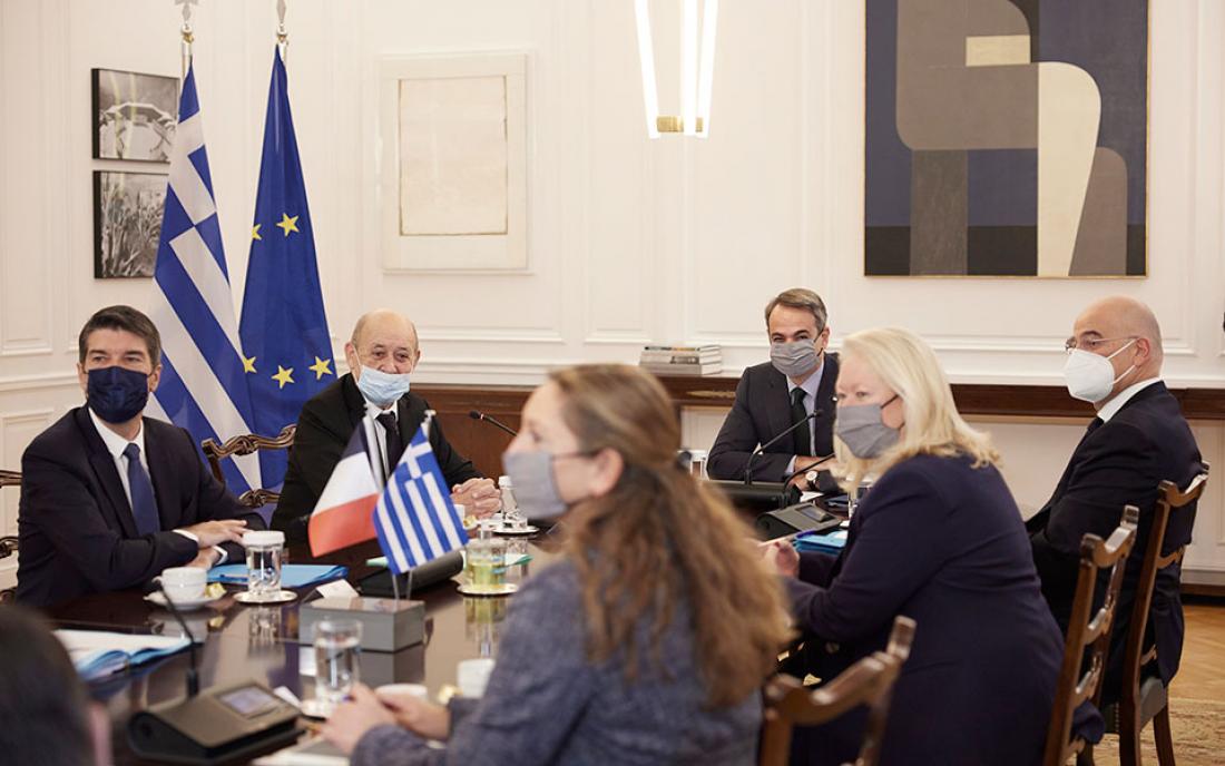 Ο Πρωθυπουργός Κυριάκος Μητσοτάκης συναντήθηκε το πρωί στο Μέγαρο Μαξίμου με τον Υπουργό Εξωτερικών της Γαλλίας, Jean-Yves Le Drian, ο οποίος βρίσκεται στη χώρα μας ώστε να συμμετάσχει στις εργασίες της Τετραμερούς Συνόδου Υπουργών Εξωτερικών Ελλάδας, Αιγύπτου, Κύπρου και Γαλλίας.