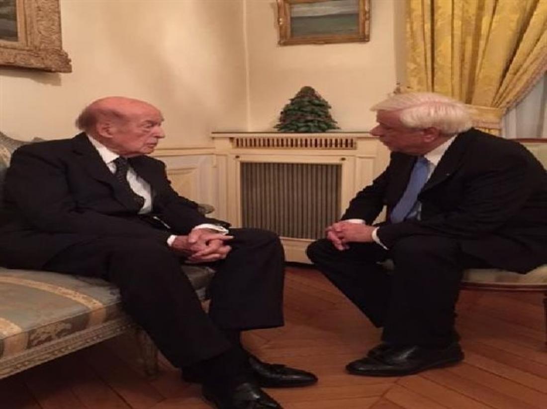 Συνάντηση με τον πρώην Πρόεδρο της Γαλλίας, Βαλερί Ζισκάρ Ντ' Εστέν, σε εγκάρδια ατμόσφαιρα, είχε ο Πρόεδρος της Δημοκρατίας, Προκόπης Παυλόπουλος, το βράδυ της Τρίτης στην ελληνική πρεσβεία στο Παρίσι.