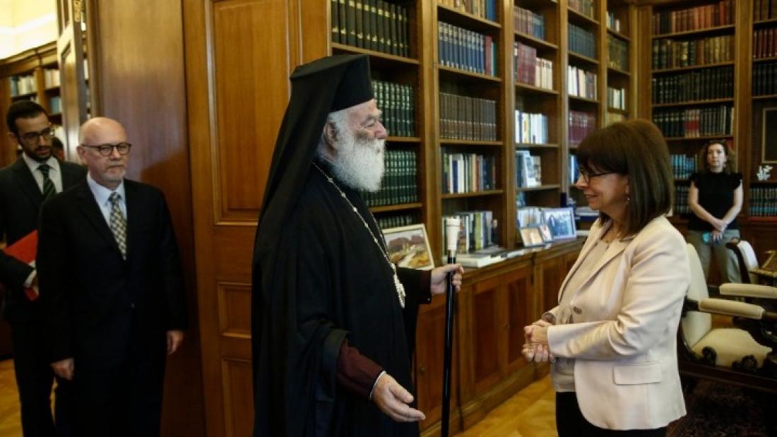Η Πρόεδρος της Δημοκρατίας Κατερίνα Σακελλαροπούλου δέχθηκε νωρίτερα σήμερα στο Προεδρικό Μέγαρο, τον Πάπα και Πατριάρχη Αλεξανδρείας και Πάσης Αφρικής, κ.κ. Θεόδωρο Β΄, ο οποίος την ενημέρωσε για το σημαντικό ιεραποστολικό, εκπαιδευτικό, κοινωνικό και φιλανθρωπικό έργο του Πατριαρχείου, καθώς και για τα έντονα προβλήματα που αντιμετωπίζουν οι χώρες της Αφρικής.