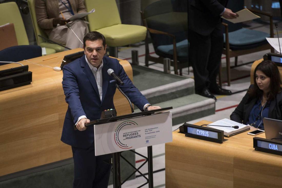 "Θα ήθελα να ευχαριστήσω θερμά τον Γενικό Γραμματέα [των Ηνωμένων Εθνών] για τη σημερινή, σημαντική του πρωτοβουλία, καθώς και για την υποστήριξη των Ηνωμένων Εθνών προς την Ελλάδα. Η μεγάλη μετακίνηση προσφύγων και μεταναστών αποτελεί μια παγκόσμια πρόκληση που κανένα κράτος δε μπορεί να αντιμετωπίσει από μόνο του. Είτε θα καταφέρουμε να τη διαχειριστούμε συλλογικά, ολοκληρωμένα και στη βάση των αξιών μας είτε θα αποτύχουμε. Το χειρότερο, δε, είναι ότι δεν αντιμετωπίζουμε σήμερα μόνο τον κίνδυνο να αποτύχουμε στην αντιμετώπιση της πρόκλησης αυτής αλλά και να προδώσουμε τις αξίες μας στην προσπάθεια αυτή', ανέφερε αρχικά ο πρωθυπουργός.