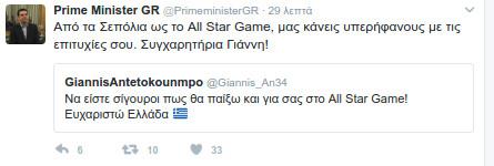 Τον Γιάννη Αντετοκούνμπο ο οποίος είναι ο πρώτος Ελληνας μπασκεμπολίστας που επιλέχθηκε να παίξει βασικός στο All Star Game του ΝΒΑ, συνεχάρη ο πρωθυπουργός Αλέξης Τσίπρας με ανάρτησή του στο Twitter.
