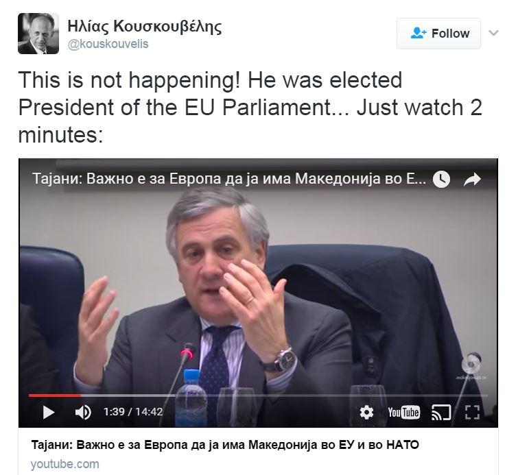 Οι θέσεις του νέου πλέον Προέδρου του Ευρωπαϊκού Κοινοβουλίου, Αντόνιο Ταγιάνι, προκαλούν θύελλα αντιδράσεων, αν και μόλις ήρθαν στην επιφάνεια αφού σήμερα τις αποκάλυψε το κεντρικό δελτιο ειδήσεων του Ant1. Ωστόσο, οι δηλώσεις αυτές έγιναν πριν μερικούς μήνες όταν ο Ταγιάνι είχε βρεθεί στα Σκόπια ως Ευρωπαίος Επίτροπος και είχε αποκαλέσει τα Σκόπια ..."Μακεδονία".