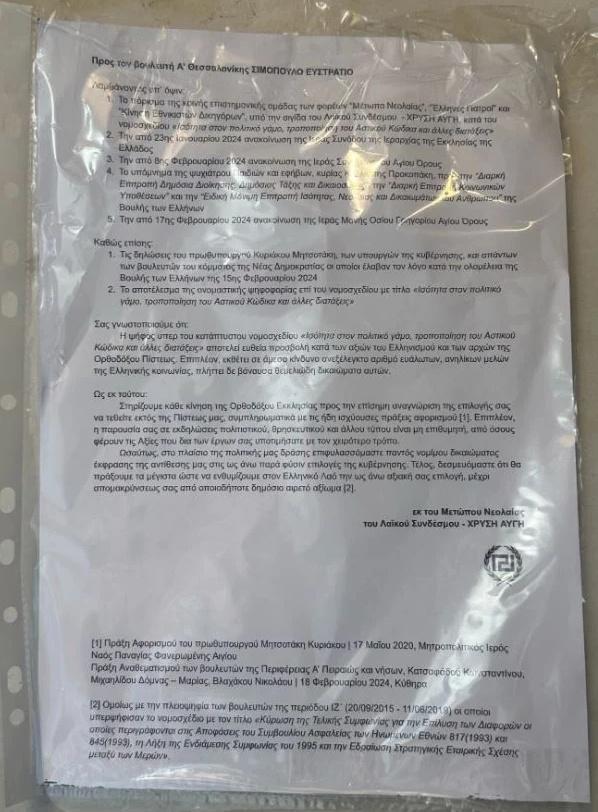 Μια απειλητική επιστολή που την υπογράφει η νεολαία της ναζιστικής «Χρυσής Αυγής» βρήκε τοιχοκολλημένη στην εξώπορτα του γραφείου του ο βουλευτής Α’ Θεσσαλονίκης της ΝΔ Στράτος Σιμόπουλος, με θέμα τη θετική του ψήφο στον νόμο για τον γάμο των ομόφυλων ζευγαριών.