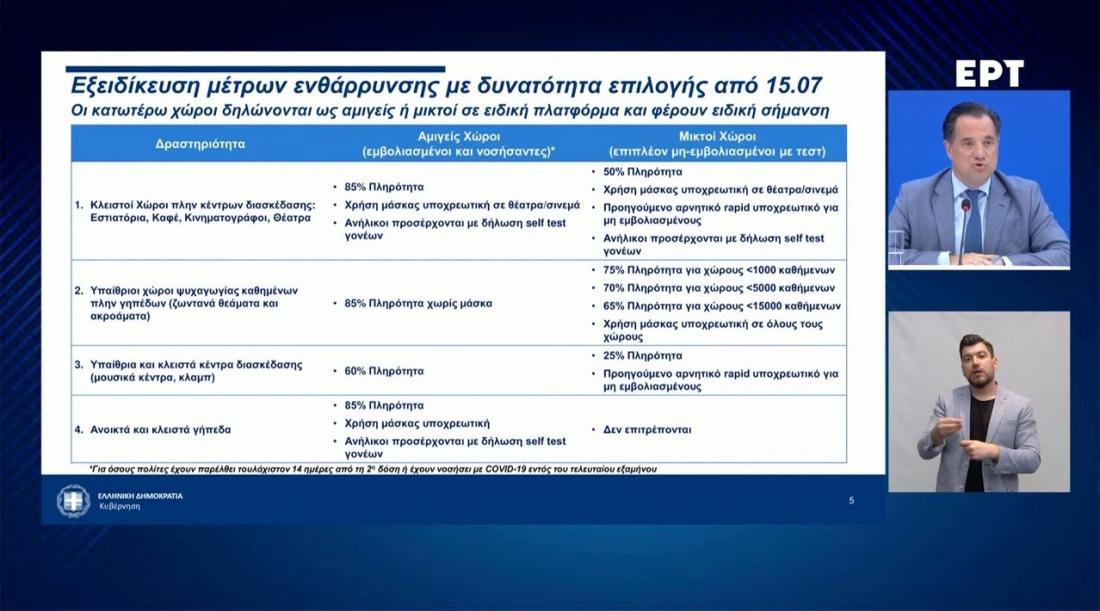«Θα έχουμε κλειστούς χώρους όπως κινηματογράφοι, θέατρα αλλά και ανοιχτούς χώρους που θα έχουν διαβάθμιση θα είναι είτε για αμιγώς εμβολιασμένους ή μεικτοί χώροι.