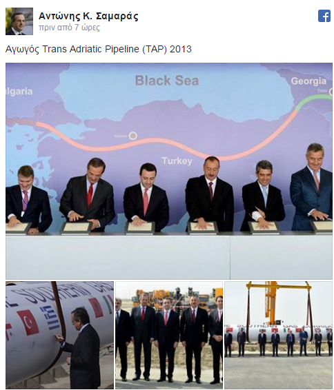 Με τέσσερις φωτογραφίες από το 2013, που "ανέβασε" στο Facebook ο Αντώνης Σαμαράς, θέλησε να υπενθυμίσει στην κυβέρνηση των ΣΥΡΙΖΑ-ΑΝΕΛ, ότι ήταν ο πρώτος που έβαλε την υπογραφή του στο έργο του αγωγού TAP.