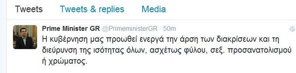 - «Η κυβέρνησή μας προωθεί ενεργά την άρση των διακρίσεων και τη διεύρυνση της ισότητας όλων, ασχέτως φύλου, σεξ. προσανατολισμού ή χρώματος».