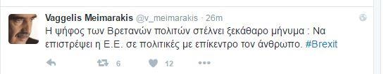 Ο Βαγγέλης Μεϊμαράκης, πρώην πρόεδρος της Νέας Δημοκρατίας, με ανάρτησή του στο twitter σχολίασε το αποτέλεσμα του βρετανικού δημοψηφίσματος: