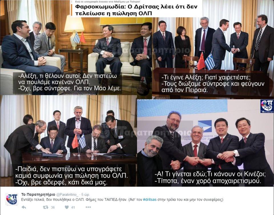 Εκτός από τη θύελλα αντιδράσεων στον πολιτικό κόμσο, τις ανακοινώσεις κόμμάτων και τα σχόλια πολιτικών προσώπων, πάρτι στήθηκε στο twitter από την απόστευτη δήλωση του Θ. Δρίτσα ότι η πώληση του ΟΛΠ δεν έχει ολοκληρωθεί ακόμη. Τι κι αν έσπευσε να «τα μαζέψει»...