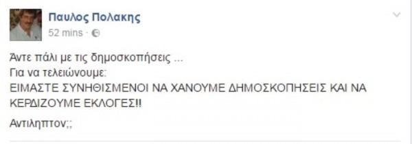 «ΥΓ.Μιλάει και ο κ. Θεοδωρικάκος για δημοσκοπήσεις. Μάλιστα. Υποθέτουμε με το κύρος του δημοσκόπου που προέβλεψε με ασφάλεια βέβαιη νίκη της ΝΔ στις τελευταίες εκλογές. Ή με τον αέρα των επιτυχιών της Gpo που έχει πέσει έξω σε όλες τις προβλέψεις από το 2012 μέχρι σήμερα.Καλή συνέχεια».