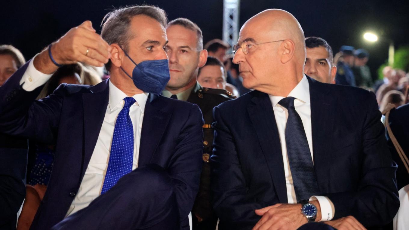 Ο Πρωθυπουργός Κυριάκος Μητσοτάκης, ο οποίος κατά τη διάρκεια της εκδήλωσης θα απευθύνει ομιλία, φορώντας μάσκα καθώς διαγνώσθηκε θετικός στον κορονοϊό, κάθισε δίπλα στον υπουργό Εθνικής Άμυνας, Νίκο Δένδια.
