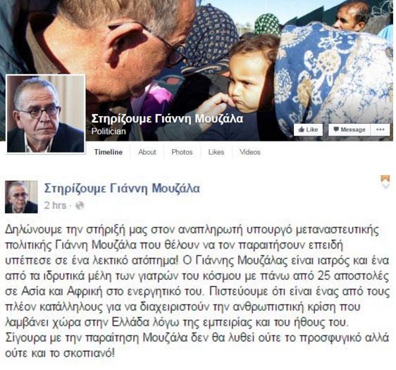 Σελίδα με τίτλο "Στηρίζουμε Γιάννη Μουζάλα" έχει δημιουργηθεί στο Facebook σε ένδειξη υποστήριξης του αναπληρωτή υπουργού Μεταναστευτικής Πολιτικής, μετά τις αντιδράσεις που έχουν προκληθεί από την αναφορά του στην ΠΓΔΜ ως "Μακεδονία".