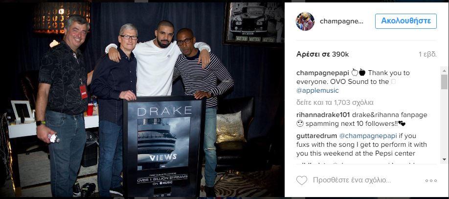 O διευθύνων σύμβουλος της Apple, Tim Cook, παρέδωσε στον 29χρονο ράπερ τιμητική πλακέτα στη διάρκεια συναυλίας του, στο Σαν Χοσέ, στην Καλιφόρνια, για να επισημάνει το απίστευτο ρεκόρ. Τι απίστευτο κατάφερε ο Drake; Το άλμπουμ «Views» του Καναδού ράπερ Drake, είναι το πρώτο που έφθασε το ένα δισεκατομμύριο streams στην on line μουσική υπηρεσία Apple Music.