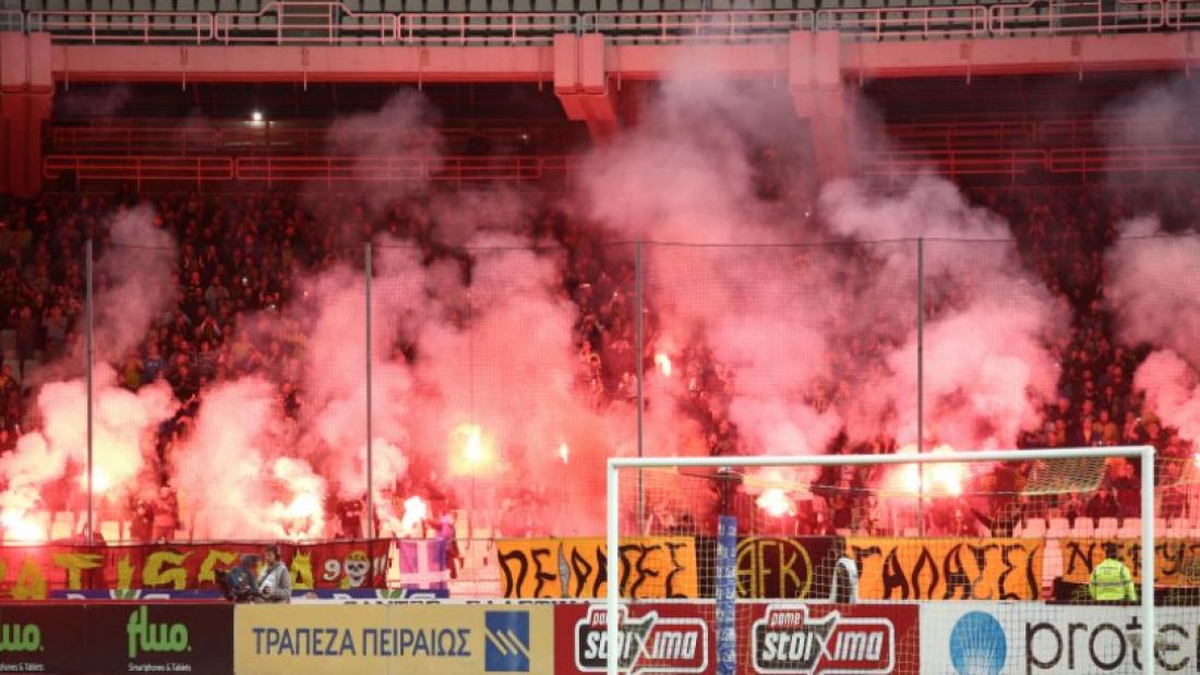 - γ. Προ και καθ’ όλη την διάρκεια του αγώνα, άγνωστοι φίλαθλοι της ομάδας της ΑΕΚ από διάφορες Θύρες του Σταδίου, έκαναν χρήση συνολικά: 30 καπνογόνων, 250 φωτοβολίδων χειρός (πυρσοί) και 10 κροτίδων.