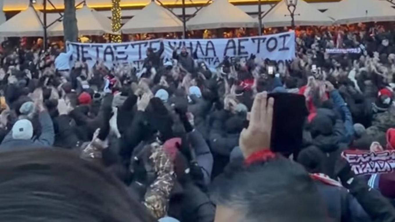 «Πετάξτε ψηλά αετοί. Με το κασκόλ στο χέρι» , ανέφερε το πανό των οπαδών του Ολυμπιακού .