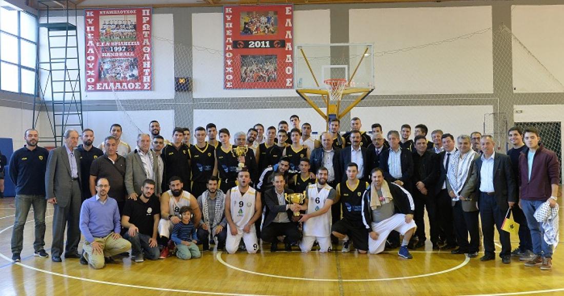 Στο ημίχρονο οι εκπρόσωποι της Παλαιστινιακής Κοινότητας βράβευσαν τον δήμαρχο Βριλισσίων, Ξενοφώντα Μανιατογιάννη και την ΑΕΚ, ενώ στο φιλικό επικράτησαν οι Νέοι με 77-66.