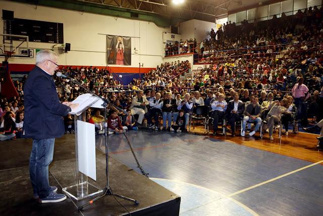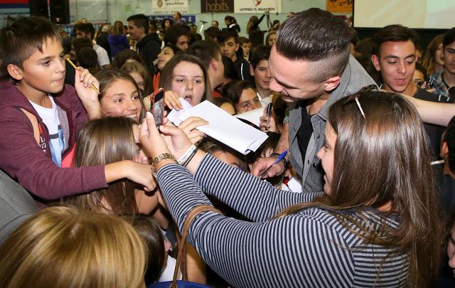 Το κλειστό γέμισε από περίπου 2.000 μαθητές της πόλης, οι οποίοι αποθέωσαν τον Πετρούνια, ενώ έσπευσαν να του δώσουν από κοντά τα συγχαρητήρια τους και φυσικά να βγάλουν φωτογραφίες μαζί του και να πάρουν αυτόγραφο.