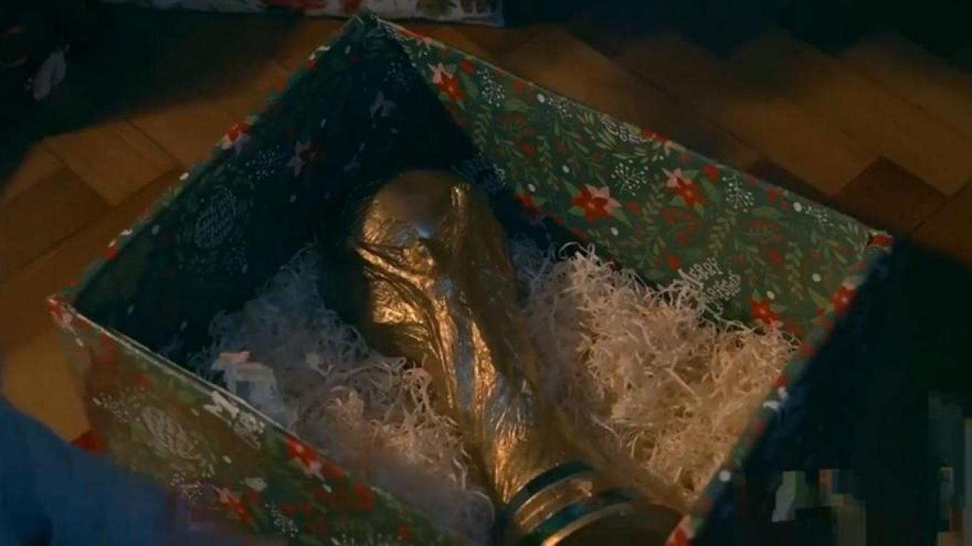 Με ένα παιδάκι να ξετυλίγει το δώρο του και να βλέπει πως μέσα στο κουτί υπάρχει το τρόπαιο του Μουντιάλ .