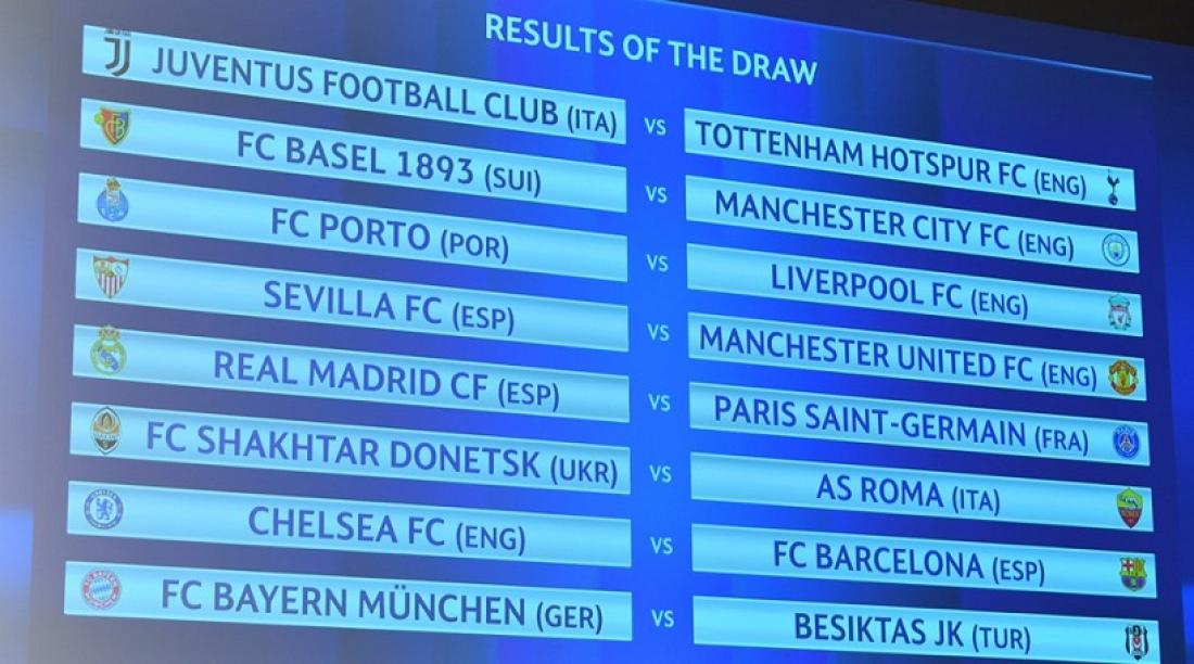 Αναλυτικά τα ζευγάρια: Γιουβέντους (Ιταλία)-Τότεναμ (Αγγλία) Βασιλεία (Ελβετία)-Μαν. Σίτι (Αγγλία) Πόρτο (Πορτογαλία)-Λίβερπουλ (Αγγλία) Σεβίλλη (Ισπανία)-Μαν. Γιουνάιτεντ (Αγγλία) Ρεάλ Μαδρίτης (Ισπανία)-Παρί Σεν Ζερμέν (Γαλλία) Σαχτάρ Ντόνετσκ (Ουκρανία)-Ρόμα (Ιταλία) Τσέλσι (Αγγλία)-Μπαρτσελόνα (Ισπανία) Μπάγερν Μονάχου (Γερμανία)-Μπεσίκτας (Τουρκία).