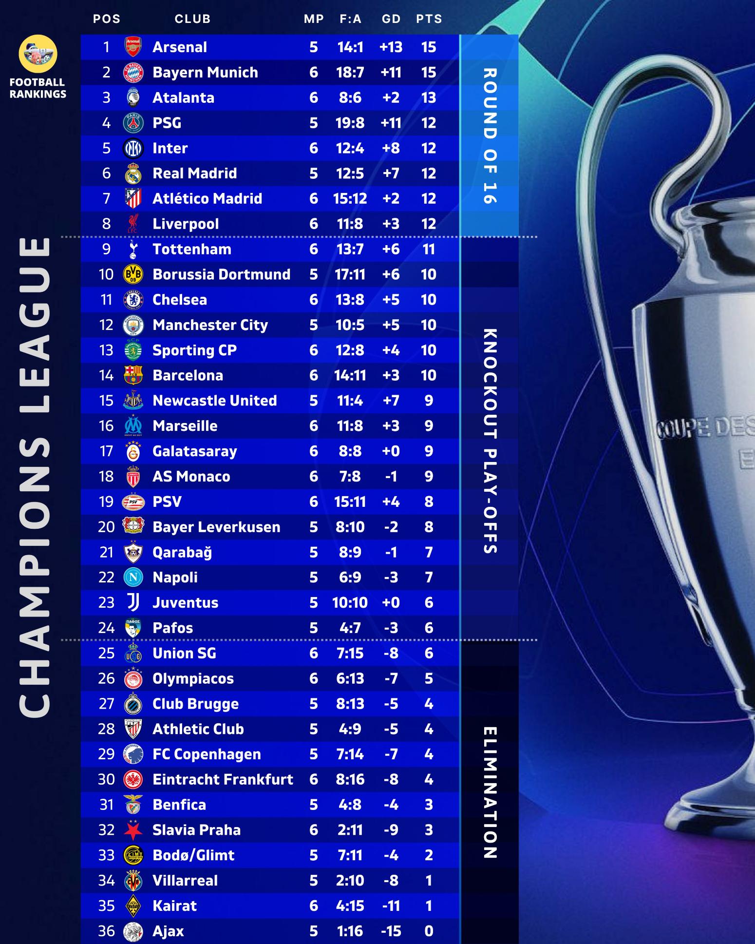 Το πρώτο σκέλος της έκτης αγωνιστικής της league phase του Champions League ολοκληρώθηκε, με τον Ολυμπιακό να κάνει άλμα στη βαθμολογία μετά την πρώτη του φετινή νίκη ενάντια στην Καϊράτ Αλμάτι.