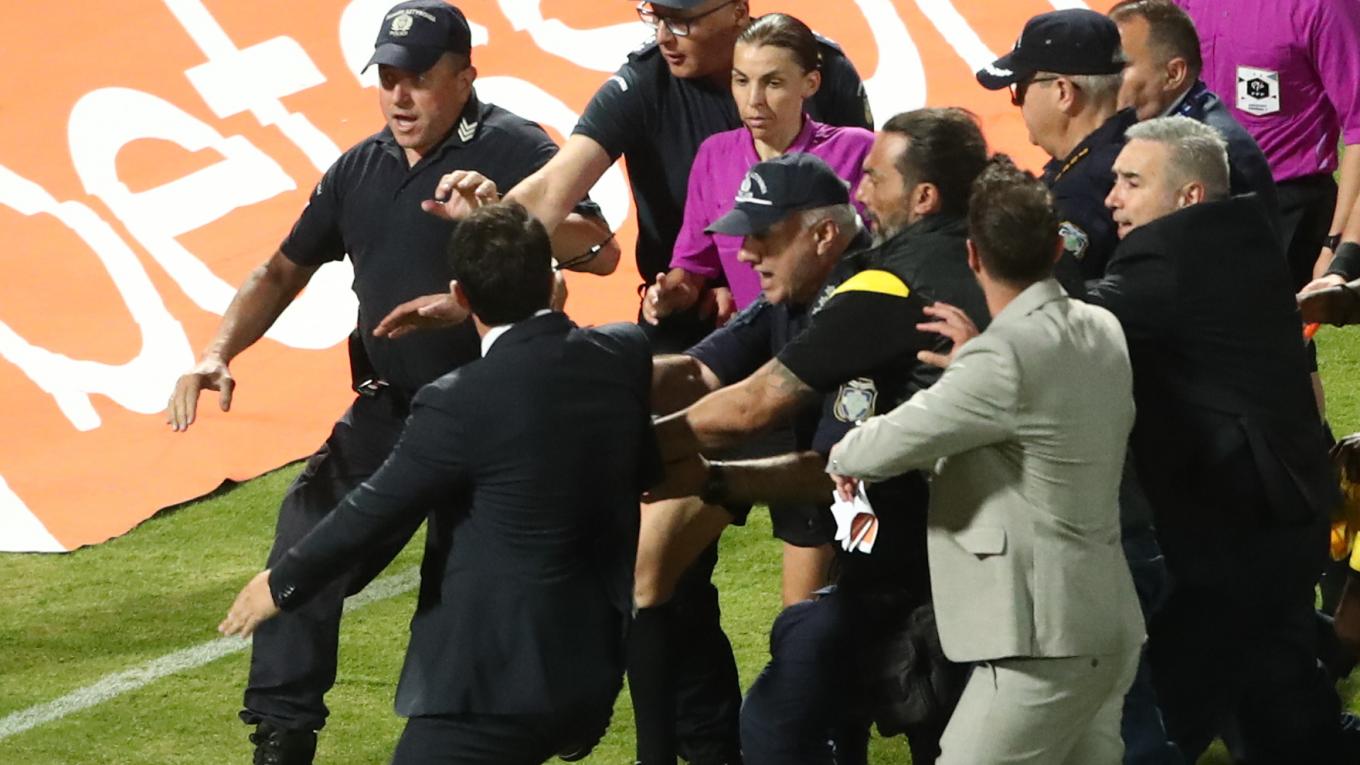 Με εικόνες ντροπής ολοκληρώθηκε ο επεισοδιακός τελικός του Κυπέλλου Ελλάδος. Με το σφύριγμα της λήξης ο ισχυρός άνδρας του Άρη Θόδωρος Καρυπίδης, κινήθηκε απειλητικά κατά της Γαλλίδας ρέφερι Στεφανί Φραπάρ με τους αστυνομικούς να σχηματίζουν ένα τείχος προστασίας γύρω της.