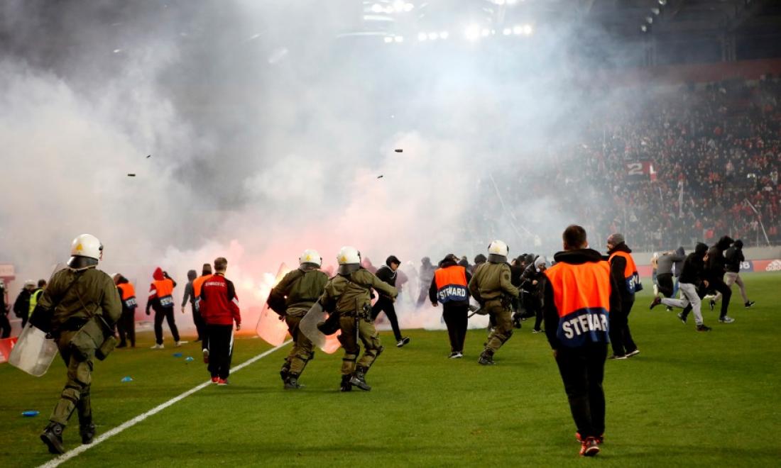 Αμέσως μετά τη λήξη του ντέρμπι, που βρήκε νικήτρια την ΑΕΚ με 2-1, οπαδοί του Ολυμπιακού μπήκαν στον αγωνιστικό χώρο του "Γ. Καραϊσκάκης" και προσπάθησαν να εισβάλλουν στα αποδυτήρια, με τα ΜΑΤ, που έκαναν εκτεταμένη χρήση δακρυγόνων, να τους απωθούν, τελικά.