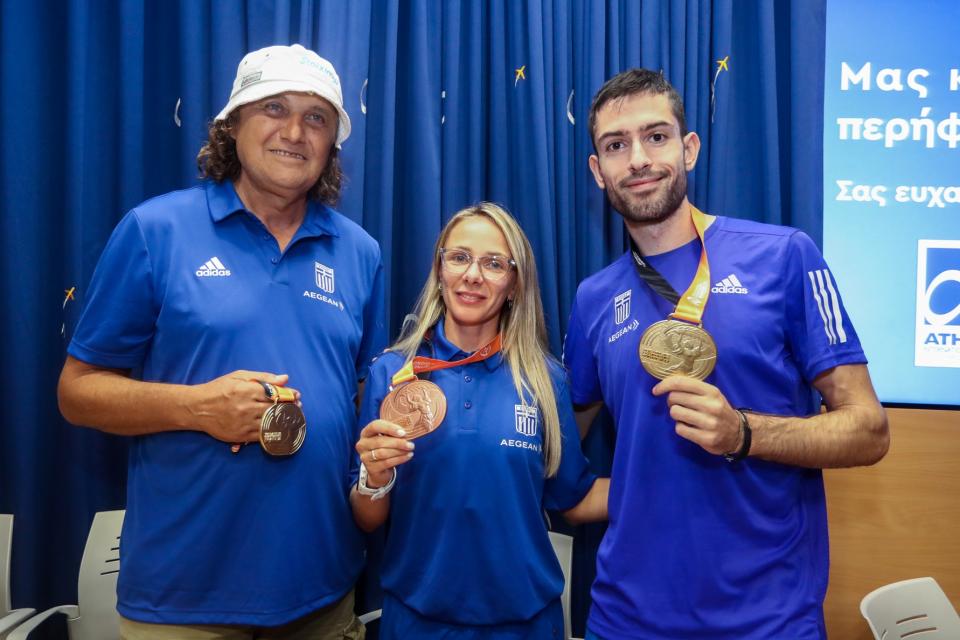 Τους αθλητές υποδέχθηκαν η πρόεδρος του ΣΕΓΑΣ, Σοφία Σακοράφα, με τον αναπληρωτή υπουργό Αθλητισμού, Γιάννη Βρούτση, και τον γενικό γραμματέα Αθλητισμού, Γιώργο Μαυρωτά.