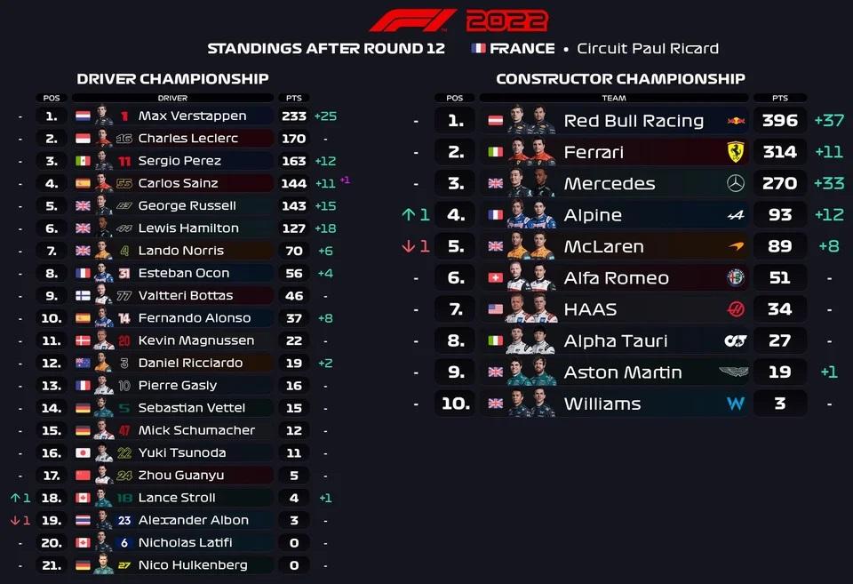 Την ίδια ώρα, στη βαθμολογία των κατασκευαστών η Red Bull Racing άνοιξε κι άλλο τη διαφορά της αφού πλέον βρίσκεται στο +82 από τη δεύτερη Ferrari.