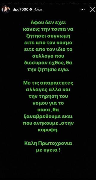 «Αφού δεν έχει κανείς την τσίπα να ζητήσει συγγνώμη είτε από τον κόσμο είτε από τον ίδιο τον σύλλογο που διέσυραν χθες, θα την ζητήσω εγώ. Με τις απαραίτητες αλλαγές, αλλά και την τήρηση του νόμου για το ΟΑΚΑ, θα ξαναβρεθούμε εκεί που ανήκουμε... Στην κορυφή. Καλή Πρωτοχρονιά με υγεία! », έγραψε στο λογαριασμό του στο Instagram ο Δημήτρης Γιαννακόπουλος.