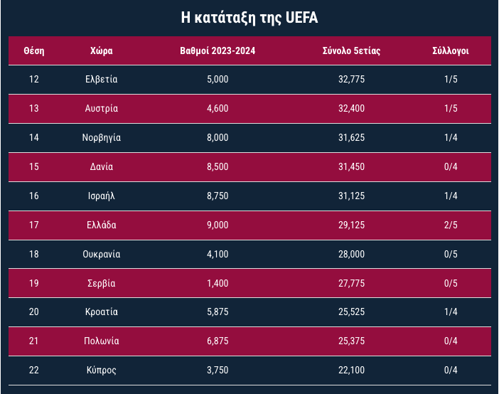 Ο "δικέφαλος " έδωσε 0,400 στη χώρα μας, η οποία ευνοήθηκε κι από τον αποκλεισμό της Μακάμπι Χάιφα από τη Φιορεντίνα , στη μάχη με τον Ισραήλ που βρίσκεται στη 16η θέση και πάνω από την Ελλάδα .