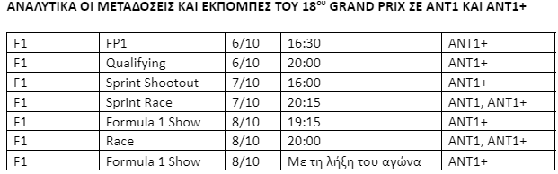 Ο αγώνας Sprint, όπου πιθανόν θα πανηγυρίσει ο Φερστάπεν τον 3ο τίτλο του, θα μεταδοθεί απευθείας από τον ΑΝΤ1 και το ΑΝΤ1+ το Σάββατο 7 Οκτωβρίου στις 20:15.