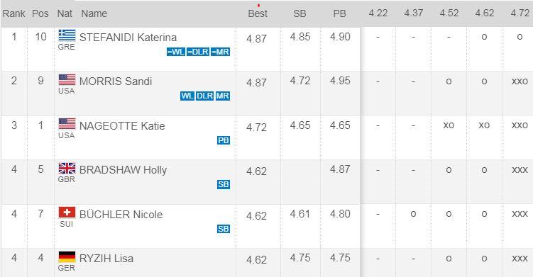 Η «χρυσή» Ελληνίδα θριάμβευσε, καθώς ήταν η μόνη αθλήτρια που προχώρησε στο ύψος των 4,72 μ. και μάλιστα χωρίς καμία αποτυχημένη απόπειρα, κατακτώντας μια παγκόσμια κορυφαία απόδοση και ένα ρεκόρ IAAF Diamond League.