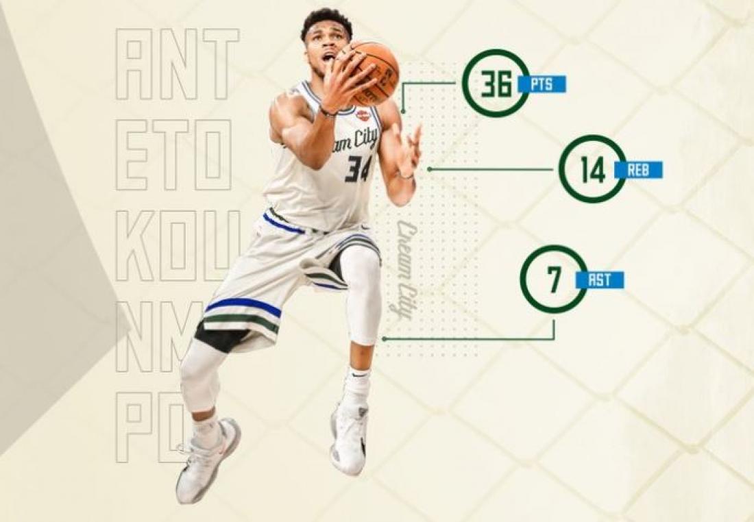 Τα «ελάφια» επικράτησαν των Μπόστον Σέλτικς με 119-112 και βελτίωσαν το ρεκόρ τους σε 54 νίκες-12 ήττες. Ο "Greek Freak" οδήγησε τους Μπακς στη νίκη, καθώς «άγγιξε» το τριπλ νταμπλ φίγκιουρ, αφού τελείωσε τον αγώνα με 36 πόντους (13/17 δίποντα, 1/3 τρίποντα, 7/12 βολές), 15 ριμπάουντ, 7 ασίστ, 1 κλέψιμο, 1 κόψιμο και 2 λάθη σε 32 λεπτά συμμετοχής.
