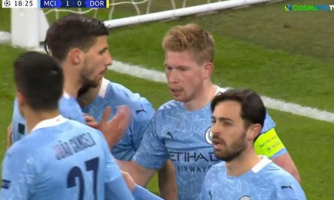 Το 1-0 της Μάντσεστερ Σίτι στην αναμέτρηση με την Μπορούσια Ντόρτμουντ. Οι «Πολίτες» έκλεψαν την μπάλα από τους γηπεδούχους με τον Μαχρέζ να πιέζει τον Τσαν, κυκλοφόρησαν ωραία την μπάλα και ο Ντε Μπρόινε άνοιξε το σκορ στο 19ο λεπτό.