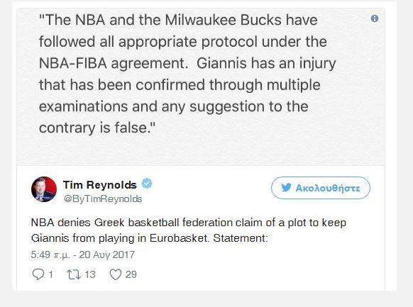 Υπενθυμίζουμε ότι ότι η μη συμμετοχή του Γιάννη στο Eurobasket είναι αποτέλεσμα «οργανωμένου και καλά σκηνοθετημένου σχεδίου από τους Μιλγουόκι Μπακς (την ομάδα του Γιάννη στο αμερικανικό πρωτάθλημα μπάσκετ) και το ίδιο το NBA».