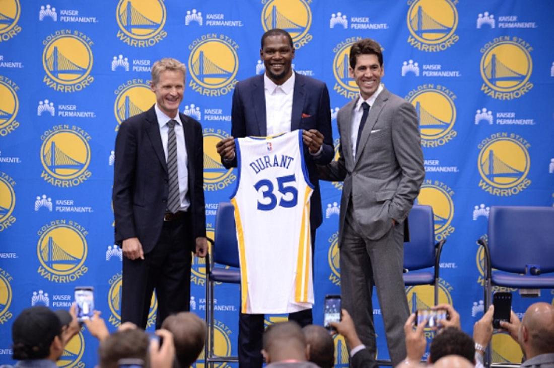 Οι Golden State Warriors, παρουσίασαν στους εκπροσώπους του τύπου με κάθε επισημότητα το νέο απόκτημα της ομάδας, τον Kevin Durant, ο οποίος πόζαρε για πρώτη φορά με τη νέα του φανέλα και το "35" στην πλάτη.