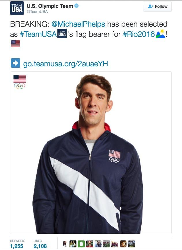 Ο Μάικλ Φέλπς, θα είναι ο σημαιοφόρος της Ολυμπιακής ομάδας των ΗΠΑ, στην τελετή έναρξης, των Ολυμπιακών Αγώνων του Ρίο Ντε Τζανέιρο, την Παρασκευή 5 Αυγούστου.