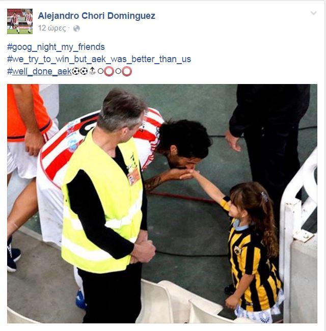 «Καληνύχτα φίλοι μου. Προσπαθήσαμε να νικήσουμε, αλλά η ΑΕΚ ήταν ανώτερη από εμάς. Μπράβο ΑΕΚ», έγραψε, ποστάροντας και τη φωτογραφία που φιλάει το χέρι της μικρής κόρης του Ντιέγκο Μπουονανότε.