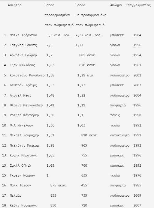 Η έρευνα της Sportico συμπεριέλαβε τα κέρδη κατά τη διάρκεια της καριέρας μέχρι το 2022 και τα προσάρμοσε με τον πληθωρισμό. Τα κέρδη υπολογίζονται μέχρι τη στιγμή του θανάτου για τους Άρνολντ Πάλμερ και Κόμπι Μπράιαντ. Όλα τα κέρδη είναι προ φόρων και πριν από τυχόν αμοιβές για μάνατζερ και δικηγόρους.