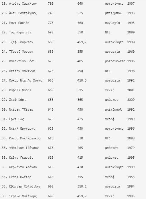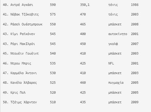 Η Σερένα Ουίλιαμς είναι η μόνη γυναίκα που βρίσκεται στο Top 50 και συγκεκριμένα στο Νο 38 με 600 εκατομμύρια δολάρια. Η κάτοχος 23 τίτλων Grand Slam στο μονό είναι η ηγέτιδα όλων των εποχών με χρηματικά έπαθλα 95 εκατομμυρίων δολαρίων στην WTA, αλλά έχει κερδίσει το μεγαλύτερο μέρος του εισοδήματός της εκτός κορτ μέσω δεκάδων συμφωνιών, συμπεριλαμβανομένων εκείνων με τις Nike, AT&T, Beats, Ford Motor, Gatorade και Subway. Η Ουίλιαμς κατέλαβε πέρυσι τη δεύτερη θέση μεταξύ των πιο ακριβοπληρωμένων αθλητριών στον κόσμο με 35 εκατομμύρια δολάρια, πίσω από τη Ναόμι Οσάκα (53 εκατομμύρια δολάρια).