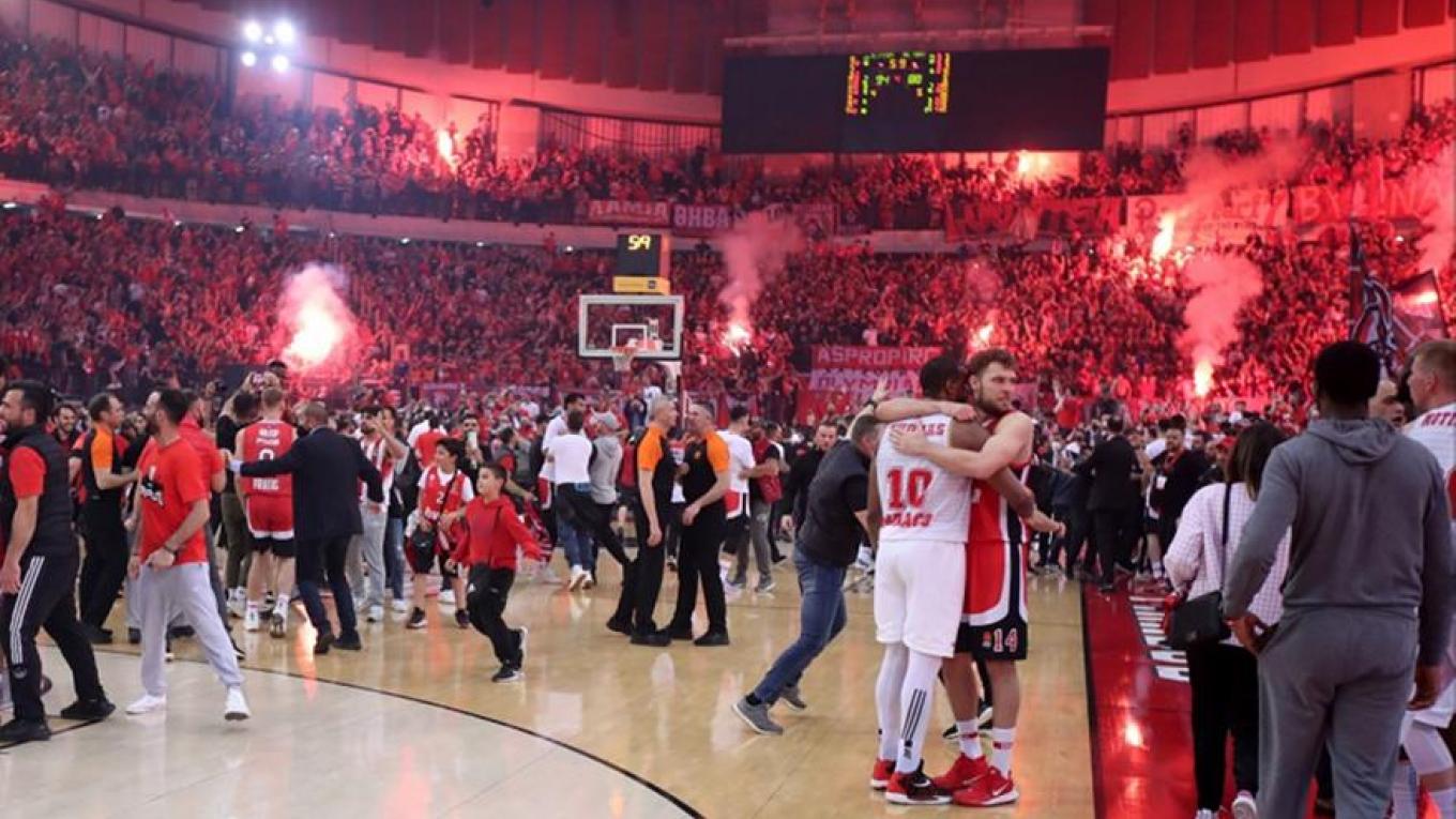 Θυμίζουμε ότι δεκάδες φίλοι του Ολυμπιακού με το παιχνίδι να έχει κριθεί και τον Τάιλερ Ντόρσεϊ στην τελευταία διαδικαστική επίθεση, μπούκαραν στον αγωνιστικό χώρο. Χρειάστηκε να περάσουν 2-3 λεπτά για να απομακρυνθεί το κοινό από το παρκέ κι αφού ρυθμίστηκε ξανά το ρολόι, το παιχνίδι ολοκληρώθηκε ομαλά για να γίνει αυτή τη φορά νέα... πανηγυρική εισβολή.